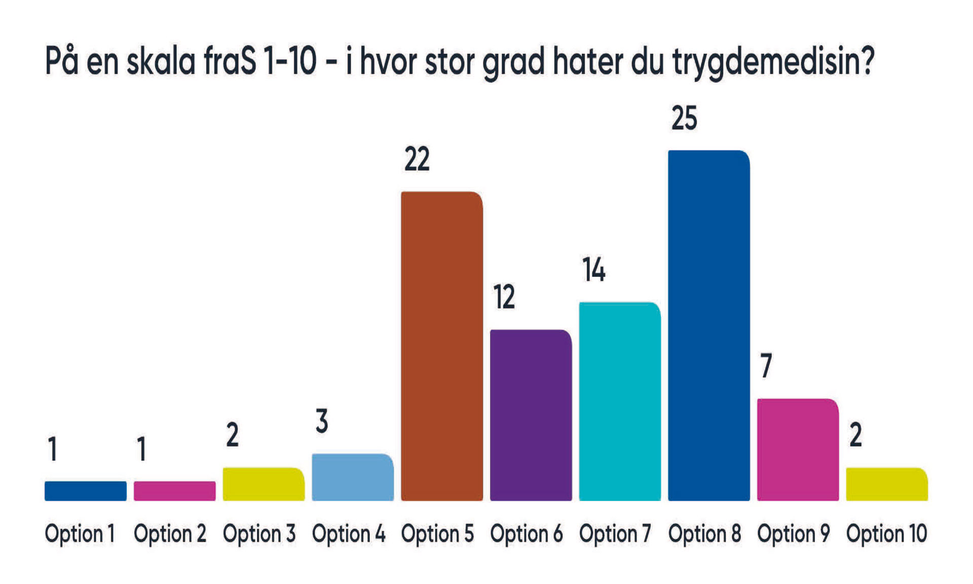 Jeg introduserer det første spørsmålet rett etter at jeg har ønsket velkommen, fortalt hvem jeg er, og hva programmet for dagen er. Jeg gjør det humoristisk og sier: «På en skala fra 1–10 – hvor mye hater du trygdemedisin?! Jeg har ikke med alternativet null – det er umulig ikke å ha om så bare litt trygdemedisin-hat. Derfor starter skalaen på én og ikke på null!»