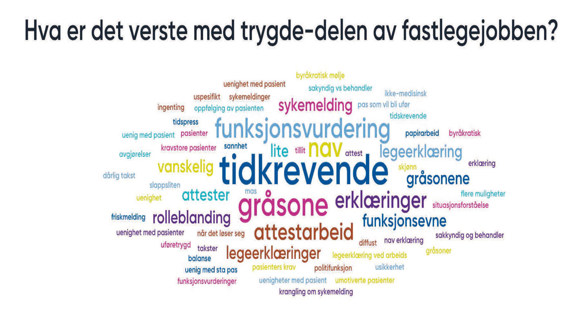 Det neste spørsmålet gir seg selv: Hva er det verste med trygdemedisindelen av fastlegejobben? Et slikt spørsmål resulterer i en ordsky hvor antall ganger samme ord er gjentatt gjenspeiles i ordenes størrelse. De vanligste ordene blir: Tidkrevende, gråsone, erklæringer, attestarbeid og funksjonsvurdering. Andre ord jeg merker meg er: Uenighet med pasienten, diffust, krangling om sykmelding, kravstore pasienter, ikke-medisinsk, slapp/sliten. Oppsummert: Svarene stemmer godt med min egen opplevelse av hva som er vanskelig. Det stemmer også bra med hva jeg bruker å få spørsmål om når jeg underviser i trygdemedisin.