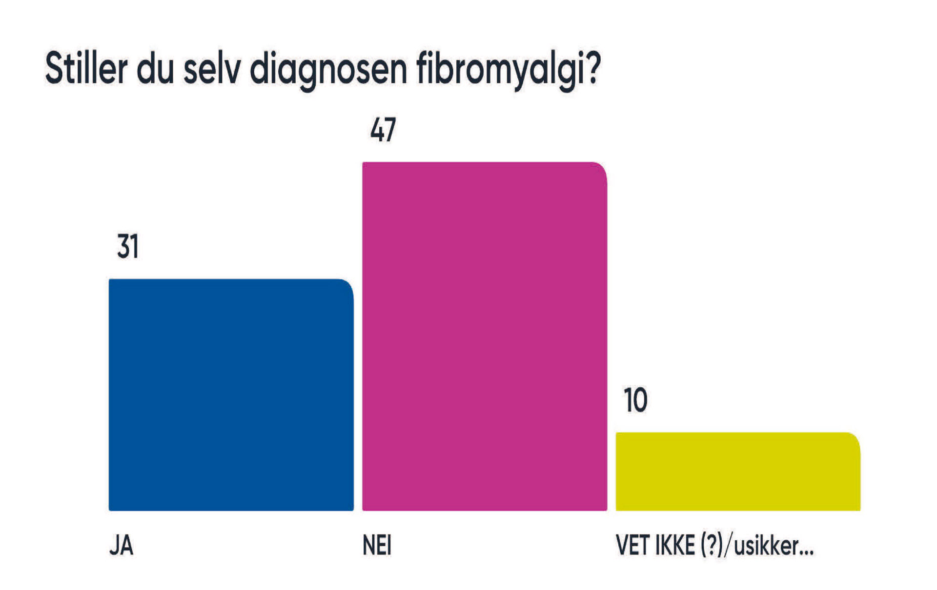 Fibromyalgi er et eksempel på en slik tilstand. Fibromyalgi er hyppig, pasientene har høy legesøkning og høy risiko for uførhet. Prognosen bedres av tidlig diagnose. Likevel tar det gjerne mange år å få en slik diagnose (1). Etter retningslinjene er det fastlegen som skal stille diagnosen fibromyalgi. På legehandboka.no står det: «Denne tilstanden anses som et allmennmedisinsk ansvarsområde og generelt uten behov for spesialisthelsetjenester». Tør og kan våre ALIS-leger å stille diagnosen? Vi er kommet til delen om uførhet i min undervisning, og jeg spør: Stiller du selv diagnosen fibromyalgi? 31 svarer ja, og 47 svarer nei. Igjen tenker jeg at svarene er tankevekkende. Svarene er også forståelige, og jeg må erkjenne at jeg selv jobbet mange år som allmennlege før jeg følte meg trygg på å stille diagnosen fibromyalgi. Svarene gir refleksjoner rundt oppfølging av pasienter med høyt symptomtrykk og lite funn. Vi får også en fin diskusjon om diagnoser som fenomen, når trenger vi egentlig diagnoser?