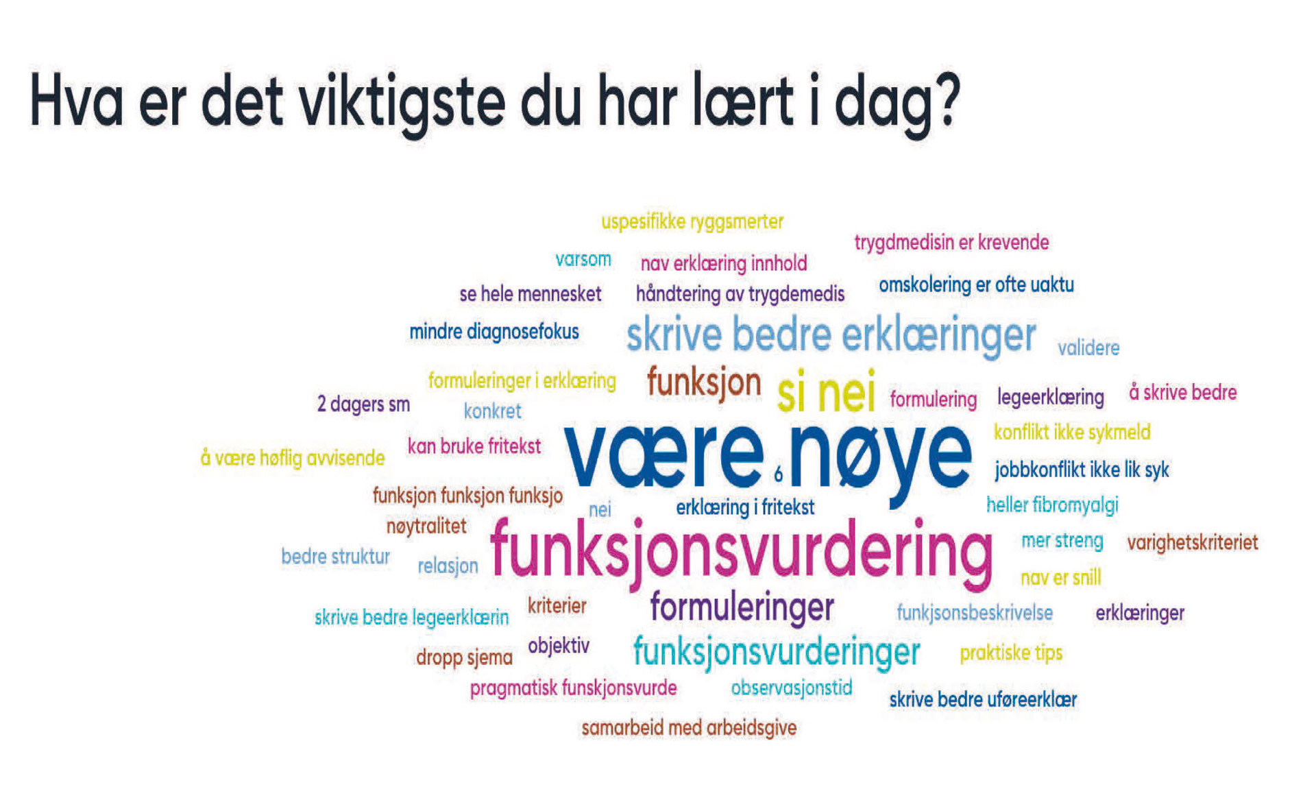 Timene går, og jeg nærmer meg avslutningen på mine seks timer med undervisning. Jeg gir meg ikke helt med mentimeter og har to spørsmål igjen: Det første er: Hva er det viktigste du har lært i dag? Jeg venter spent på svarene. Igjen får vi en ordsky. De vanligste ordene er: Være nøye. Funksjonsvurdering. Si nei. Skrive bedre erklæringer. Formuleringer.